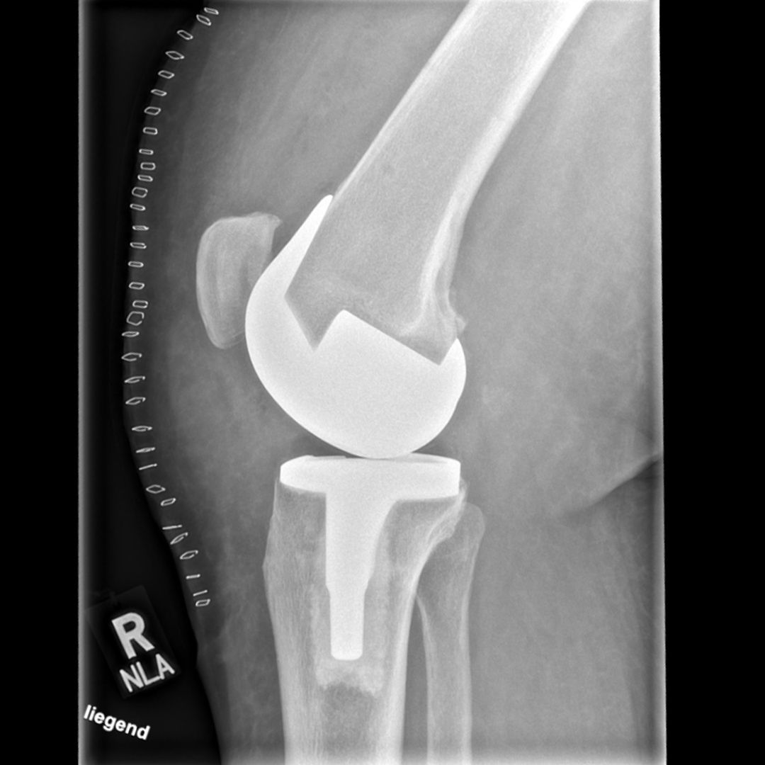 Seitliche Röntgenaufnahme eines Kniegelenks mit eingesetzter Knieendoprothese.